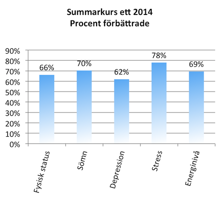 Vad får då alla dessa att prioritera våra sommarkurser? En avgörande anledning är vår huvudlärare, Dongyue Su, Att hitta en bra lärare har i alla tider varit det viktigaste om man vill utveckla sig med hjälp av qigong. Läraren är också avgörande för qifältets styrka och kvalitet. Just vårt starka qifält är en annan viktig faktor till att så många kommer till sommarkurserna. Det har byggts upp under alla år vi verkat i Sverige och Norden och blir starkare och starkare för varje år. I år hade vi några deltagare som inte gått sommarkurs på flera år. De var samstämmiga i uppfattningen att qifältet är mycket starkare nu. Också förståelsen hos deltagarna är högre idag, man tillgodogör sig qifältets möjligheter mycket mer. Man tränar mer på eget initiativ och harmonin och lugnet i träningssalen är betydligt bättre. Allt detta avspeglar sig också i de resultat deltagarna får av kursen. Trots den relativt korta tiden får många mycket goda effekter, både fysiskt och mentalt. I grafen nedan kan man utläsa hur många som fått förbättringar på några problemområden, baserat på deltagarnas egna uppgifter i en enkät ifylld direkt före och direkt efter kursen.